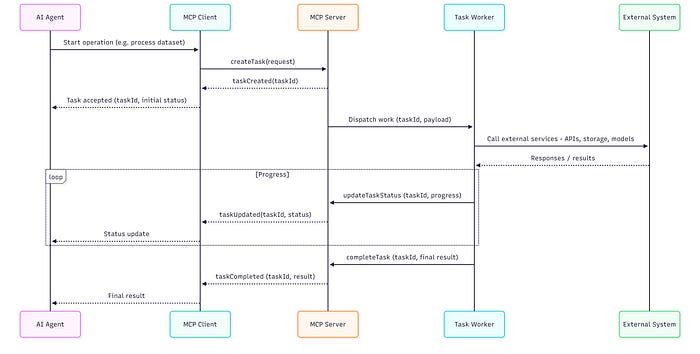 MCP servers can now create asynchronous, long-running operations. A server returns a task handle, publishes progress updates, and delivers results when the work completes.